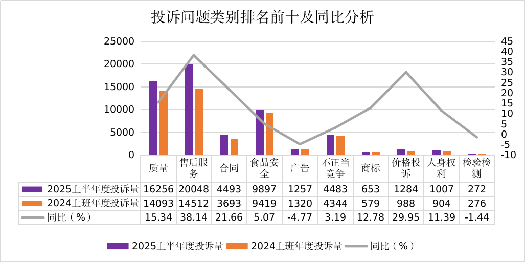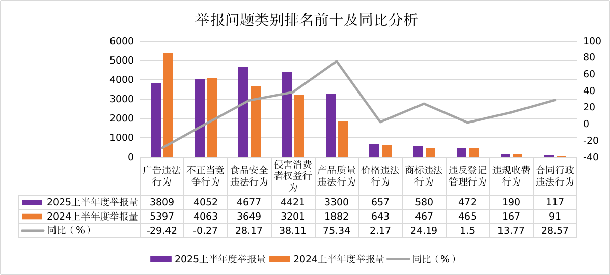赞扬举报量排名前三的商品类别是服拆鞋帽(25334件)、食物(19615件)、家居用品(8919件)。服拆鞋帽类赞扬举报同比增加10.52%,从赞扬问题类别看,违反产物标识、出产发卖不合适保障人体健康和人身、财富平安的国度尺度、行业尺度的产物,食物平安违法行为举报次要集中正在食物包拆无标签或标签标注的事项不完整实正在、运营变质、油脂酸败、霉变生虫、不洁、混有异物、掺假或者感官性状非常的食物、餐饮运营场合不整洁等方面。